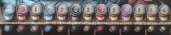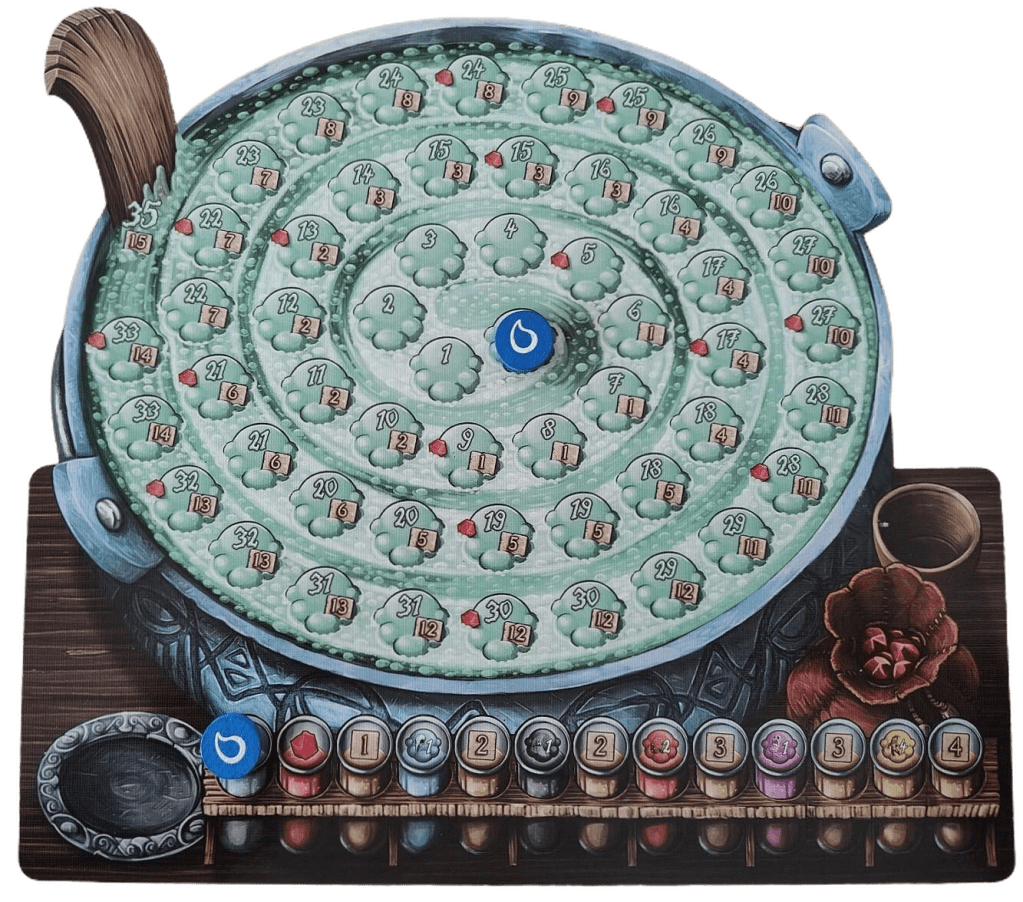 Tucked away on the backside of the game board, hidden from those who follow only the well-worn paths of traditional ingredient buying, lies a secret known only to the most cunning alchemists. This is the Potion Brewer Track, a path not of random draws and haphazard luck, but of careful investment and long-term planning. Eleven of the Fortune Teller cards, rolling for rubies or water droplets or getting the most Hawkmoths, can move your droplet forward. You chose, the potion brewers track of the cauldren.