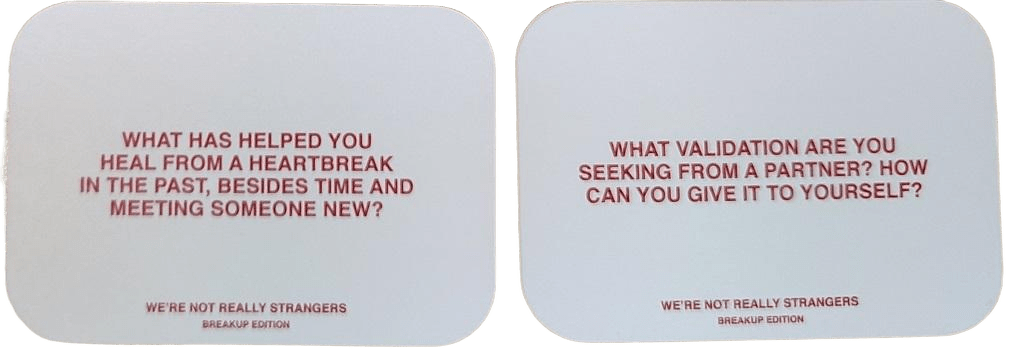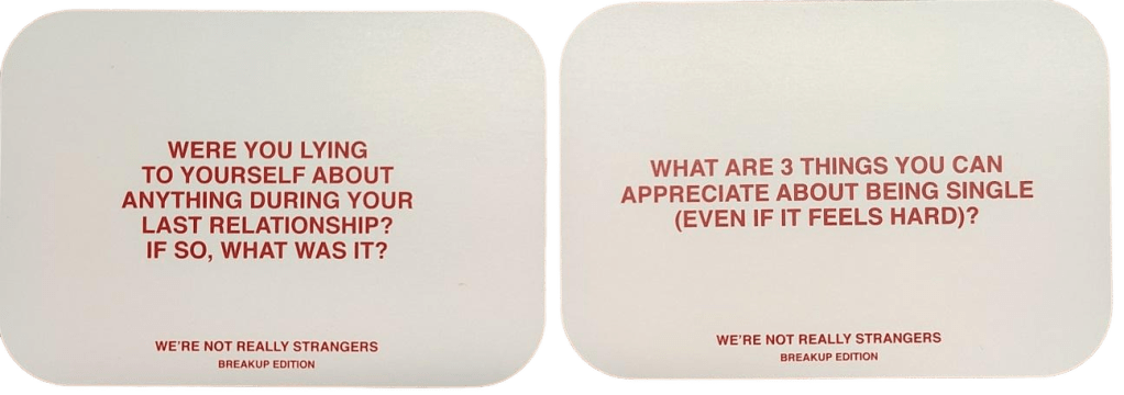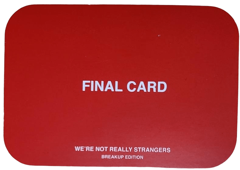 We’re Not Really Strangers: Breakup Edition isn’t about collecting points or outplaying an opponent. It doesn’t reward quick thinking or cunning moves. Instead, it invites you to sit down, take a deep breath, and ask yourself the kind of questions that most of us spend years avoiding. This game is about reflection. About sorting through the memories we carry, the stories we tell ourselves, and the things we leave unsaid. Here are a couple of cards.