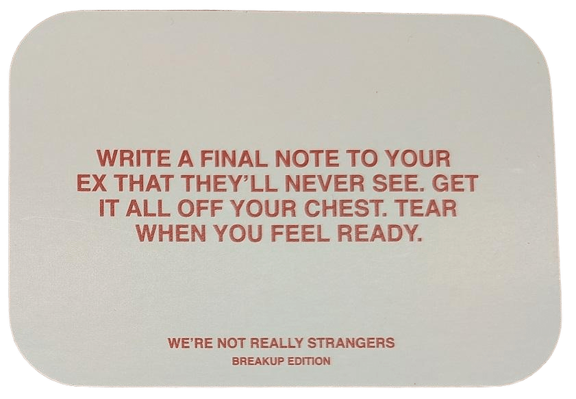 There’s no final score, no triumphant moment where you declare victory. However, there is a Final Card. This card has each person Write a final note to their ex, not for their ex, but for them. Then, when they are ready, they tear it up.