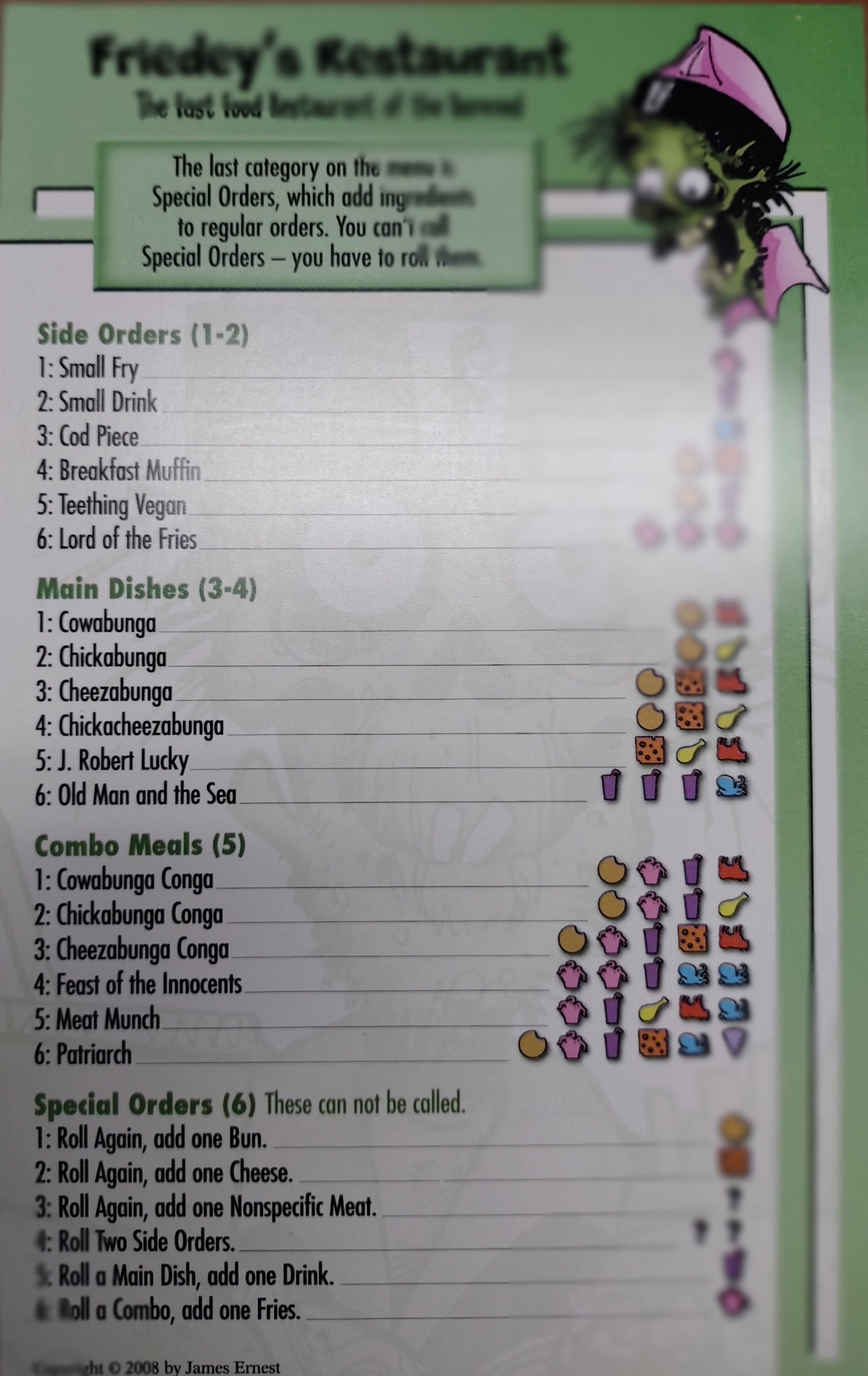 In Lord of the Fries, you’re working at Friedey’s (green menu above), a fictional fast food chain staffed entirely by zombies, and you’re trying to put together the most bizarre menu items using the cards in your hand. Every card represents an ingredient—like brains, tofu, soda, meat substitute, or other culinary oddities—and you’ll be competing with your fellow short-order ghouls to complete meals from one of the many hilarious menus. Think of all the silly things on the menu. It’s punny. It’s weird. And it’s so much fun.