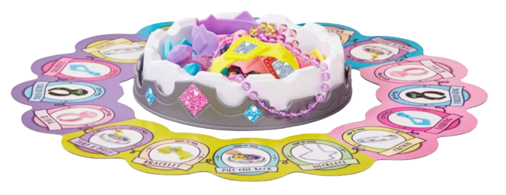 The goal is simple: spin the spinner, move around the board, and collect your royal jewelry set — piece by piece. There’s a little suspense in every turn. Will you get the earring you need? Will someone take the necklace you just won?