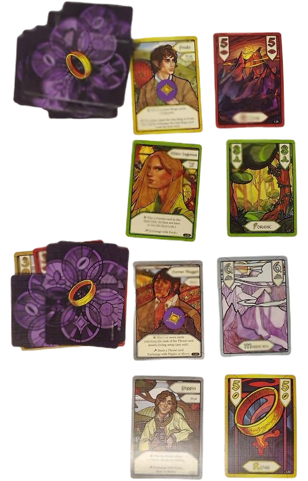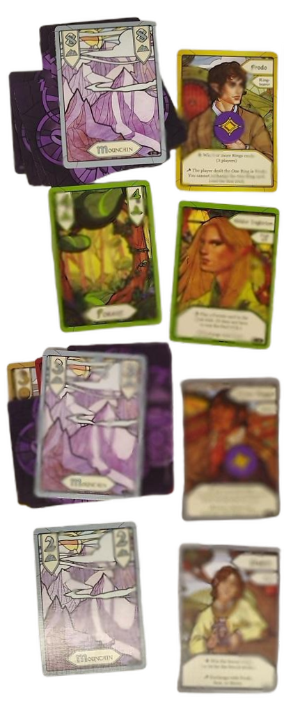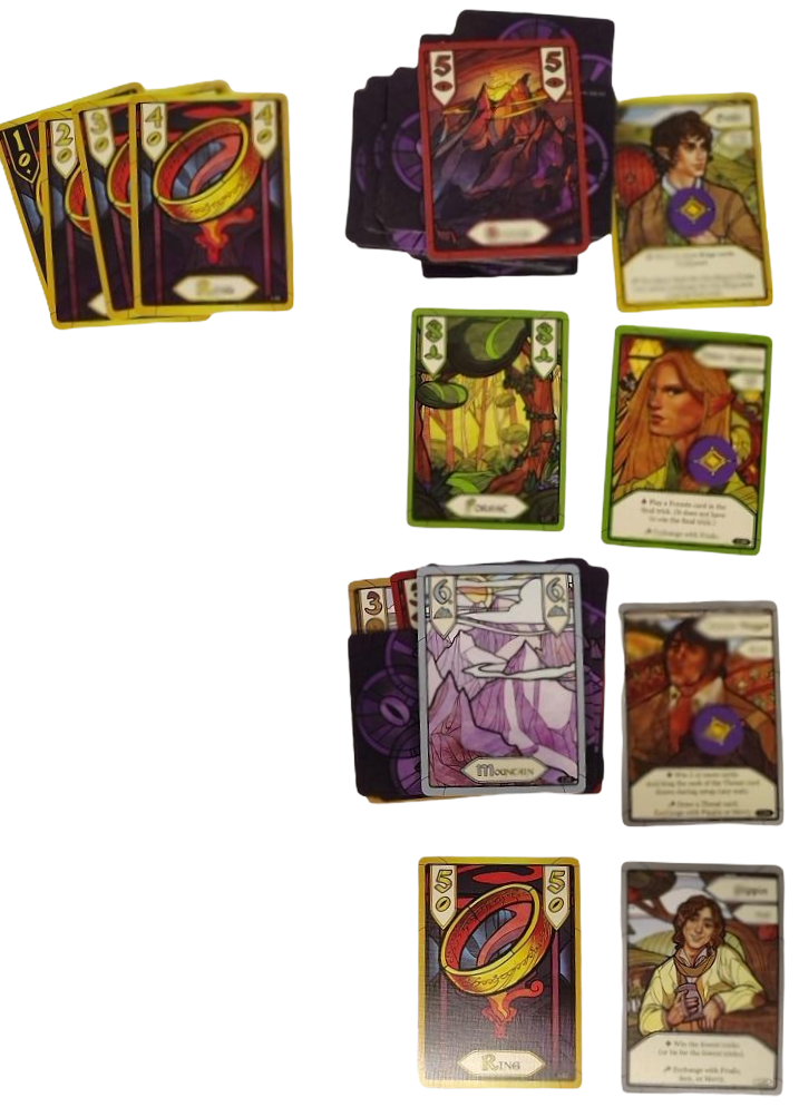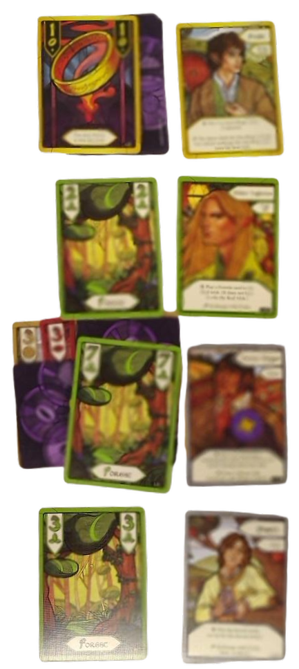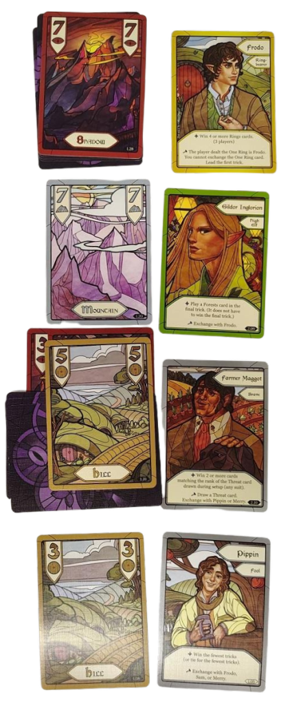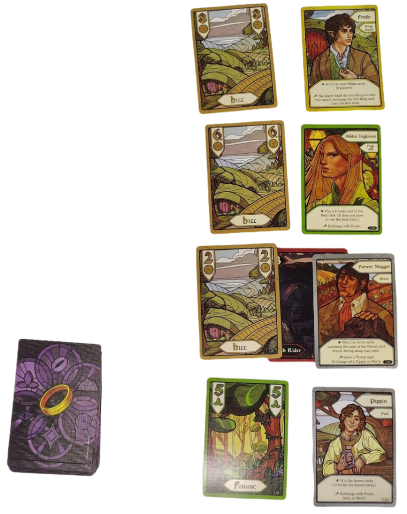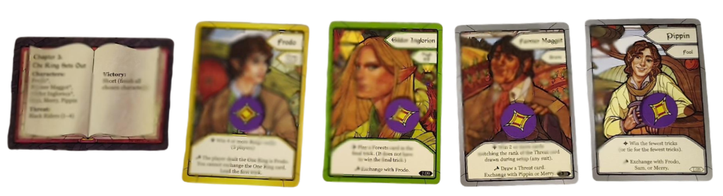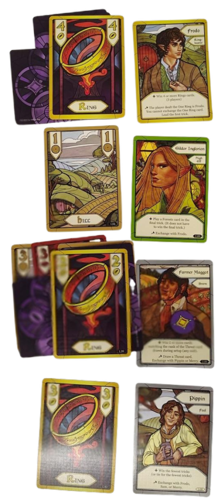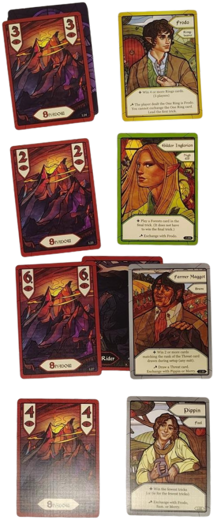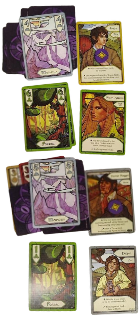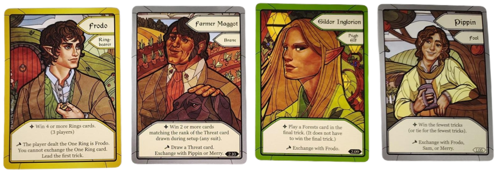 Let me tell you about each traveler’s goal: Frodo must win 4 or more Ring cards. Farmer Maggot must collect 2 cards with the number 3—any suit will do. Gildor Inglorion must play a Forest card in the final round. Pippin must win the fewest tricks of the party.