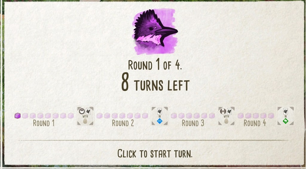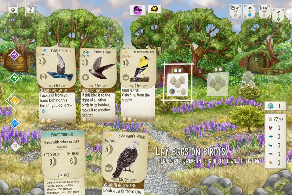 Each bird card has unique abilities that trigger during different phases of the game. Some help you gain food, others allow you to draw more cards, and some give you bonuses when laying eggs. Planning your sanctuary’s engine around these abilities is key to success. Some cards get triggered when played or when activated (each time you pass the card). You can see a few cards above.