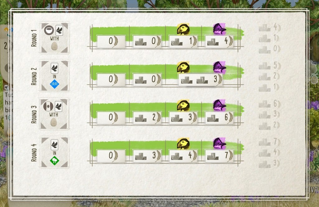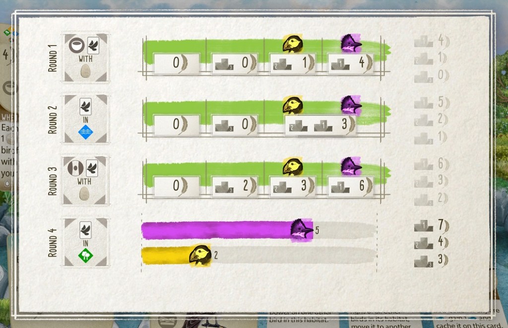 These goals push you to focus on specific strategies each round. Whether it’s having the most eggs in a certain habitat or the most birds with a specific feature, the end-of-round goals provide extra layers of strategy and points. Check out the photo below. Some goals depend on the number of eggs, the location or other things.