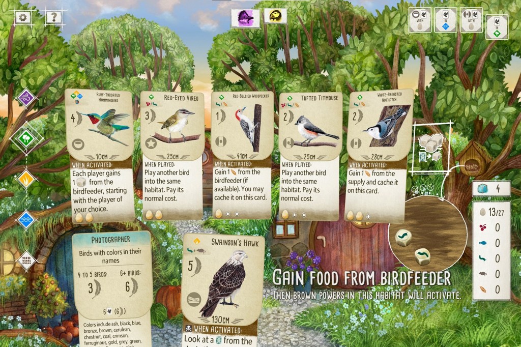 The three habitats each allow you to take different actions; the below photo has the forest. Forests are for gathering food, grasslands are for laying eggs, and wetlands are for drawing bird cards. Balancing your actions across these habitats is crucial, as each bird you play enhances your ability to take stronger actions in that habitat.