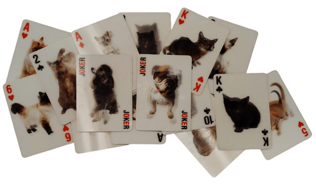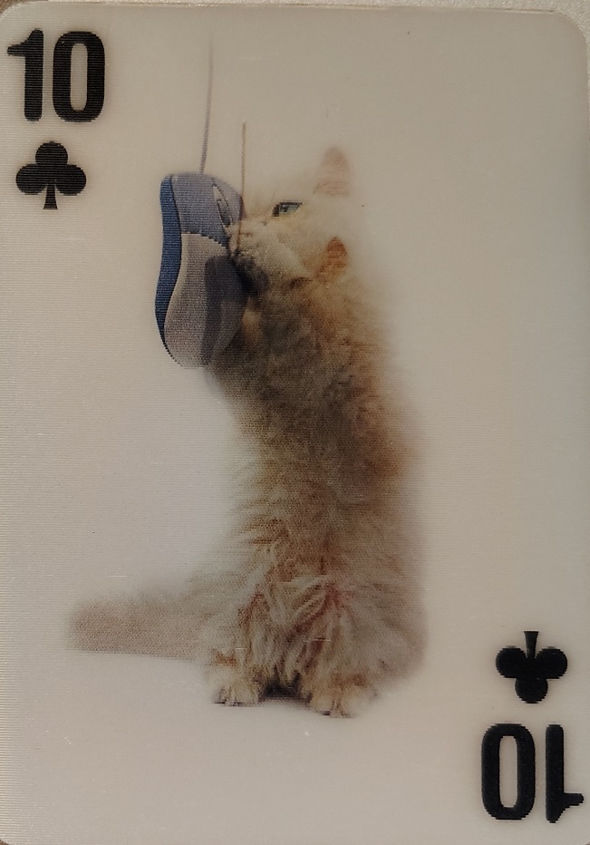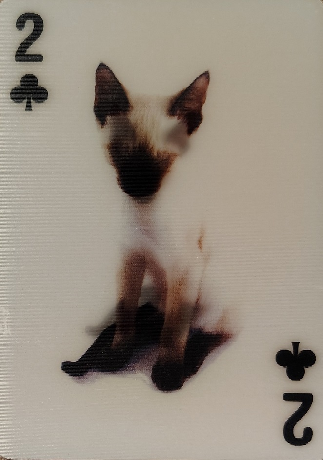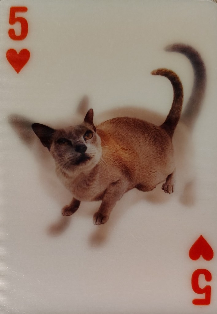 Part of the magic is how the cards make play feel different. A losing hand is somehow softer when a tiny Siamese stares up at you from the corner of your loss. They are perfect for light-hearted games or for sitting on the table as a conversation-starter while you shuffle. The photo below shows the two images that combine to make the shifting 3D design, a little hint at the cleverness tucked inside each card.