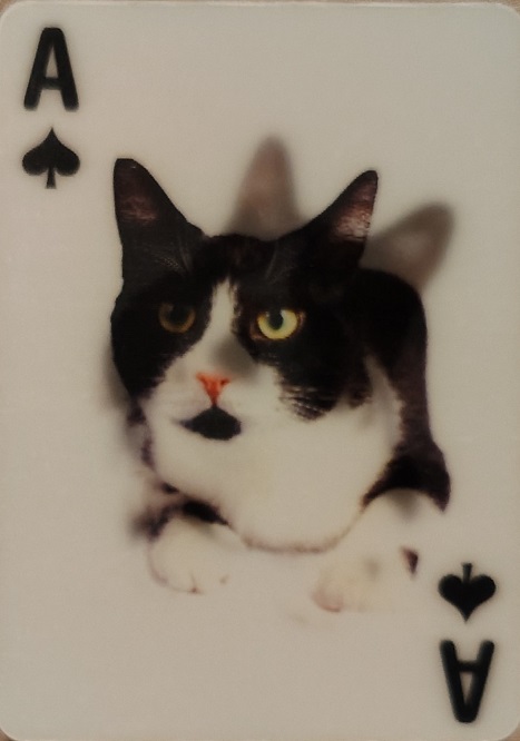 The ace of spades is a tuxedo cat that commands the table like a little monarch. Its black-and-white coat and keen gaze sit forward in the image so that the card becomes a small, arresting portrait whether it lies flat or is cupped in your hand. It feels more like art than playing material, and I kept finding myself setting it down just to look again.