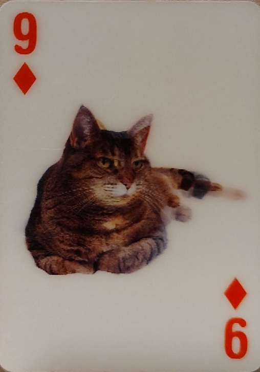 The nine of diamonds gives you a tabby with mischief in her eyes. She is all playful claws and soft seriousness at once, and the card captures that balance so perfectly that the suit seems to hum with her energy. It is the sort of image that makes you smile before you remember you are mid-hand.