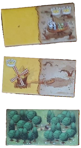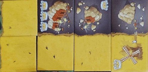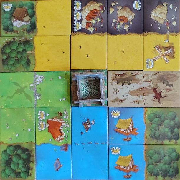 I went for a lovely mine and wheat strategy, collecting mine tiles and chasing after those glittering crowns. The above snippet of my board has 3 mine squares x 4 crowns and 1 wheat crown x 5 wheat cards, for a total of 17 points.