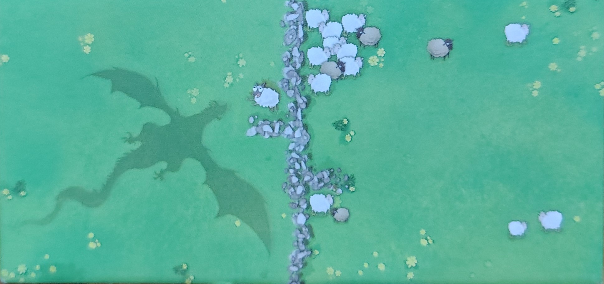 The pieces are adorable sturdy little square tiles, each illustrated with whimsical terrains—wheat fields, forests, lakes, swamps, mines, and grazing pastures—all just waiting to become part of your tiny kingdom. Notice the dragon flying over the field of sheep…so adorable.