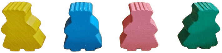 There’s also a lovely set of chunky wooden king tokens in bright colors, and a neat little pile of domino-style tiles that form the heart of the game. Here are all the meeples in the set.