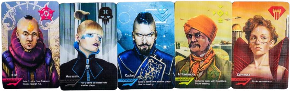 Inside the box are fifteen character cards, some coins, and reference cards to remind you who does what. Each of the five roles has three copies, and each player gets two hidden cards and two coins to begin. The Roles include the Duke, Assassin, Captain, Ambassador and the Contessa. From there, it is a game of survival and misdirection. You can claim to be anyone, so long as your voice is steady and your heart does not give you away.