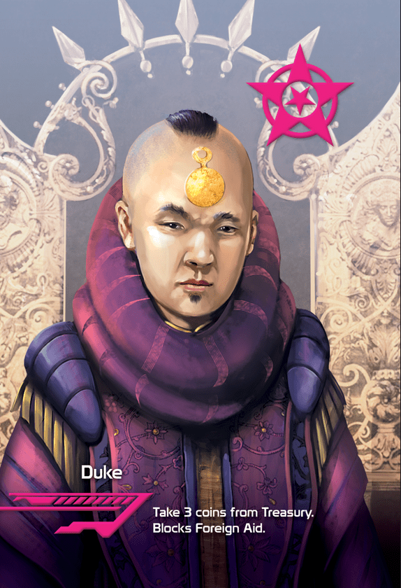 We had three players at the table, myself included. I was feeling bold and declared, right out of the gate, that I was the Duke. I collected three coins from the treasury, and nobody challenged me. Either they believed me, or they were biding their time.