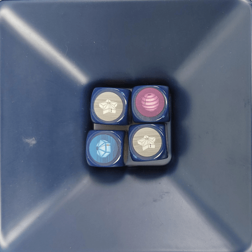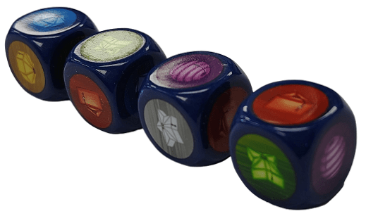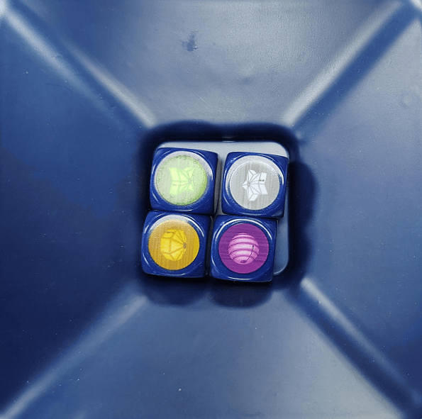 To start a round, four colorful dice are rolled and arranged into a square at the center of the table.