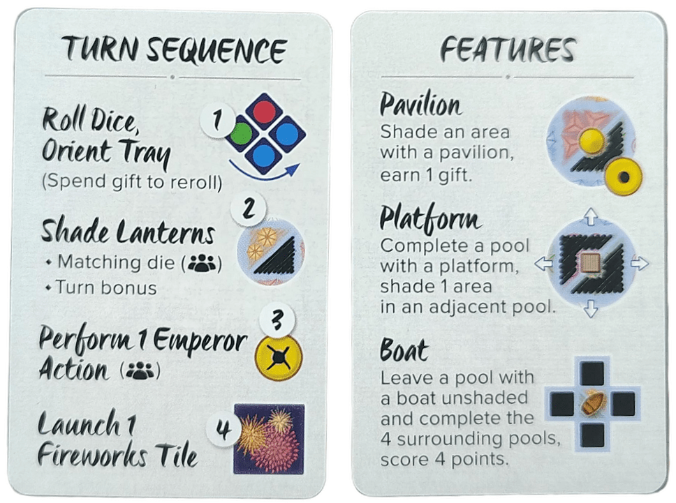 At the beginning of the game, each player receives a lake board and a pencil to track their lantern placements. Below you can see the reference cards cards, that I always depend on.