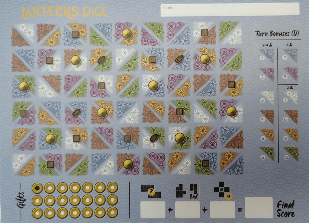 Each player then looks at the die and writes down the corresponding shape and color of the lantern tile on their board. As the game progresses, players continue filling in their lake boards with lanterns, aiming to complete fireworks patterns and earn Gifts. Players can also spend these strategically to rotate dice or take extra actions during their turn. The game continues for a set number of rounds, and when it ends, the player with the highest score is declared the winner.