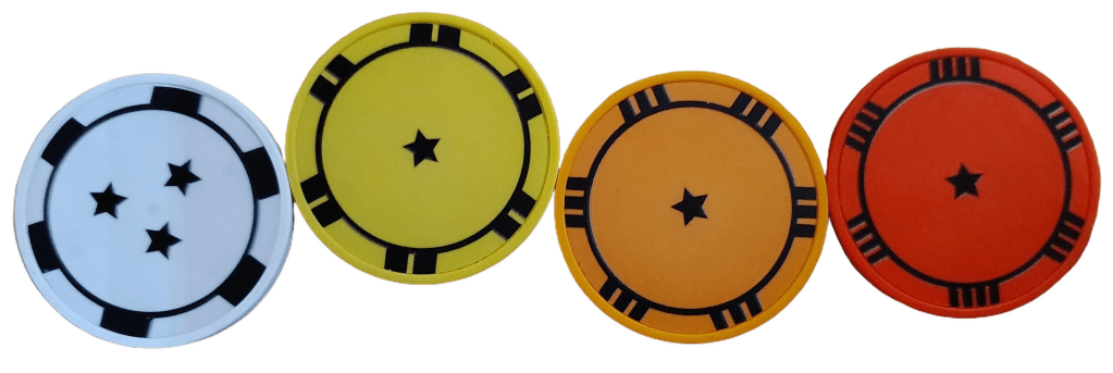 For the first round we selected the chips that designate how well our hand was. At this point, with 2 cards, it was unsteady. 1-star was the weakest and 3-star, in a three player game, was the strongest. I felt good with the first two cards and snatched the 3 star chip!