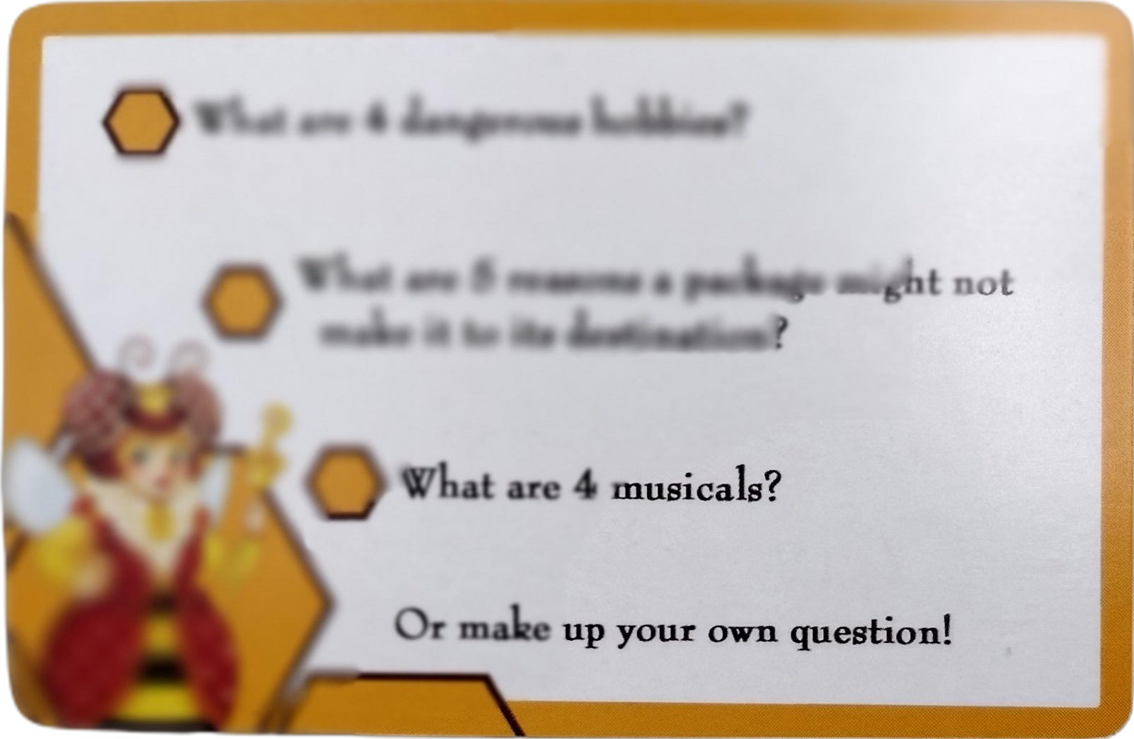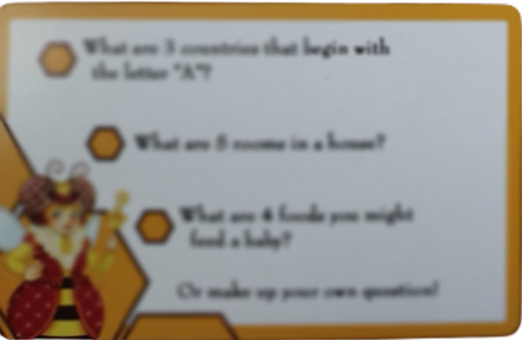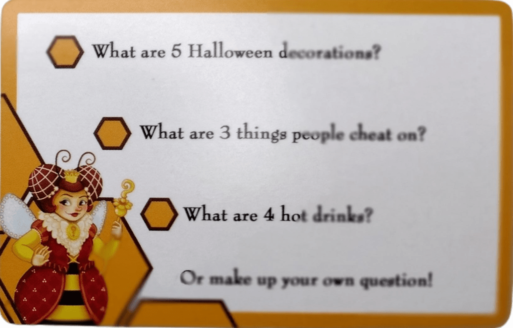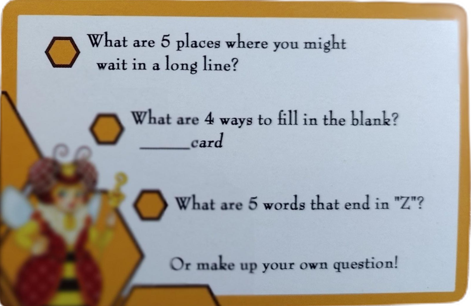 Inside the box was a thick stack of question cards, each one a little prompt waiting to unlock our shared imaginations. The rulebook was short, friendly, and sprinkled with honeycomb designs. The player tokens are colorful little bees, each with its own slot in the central hive board. It’s clever and inviting, a little whimsical, and it immediately made me want to gather friends around the table.