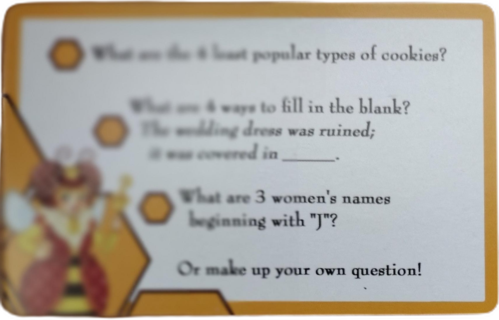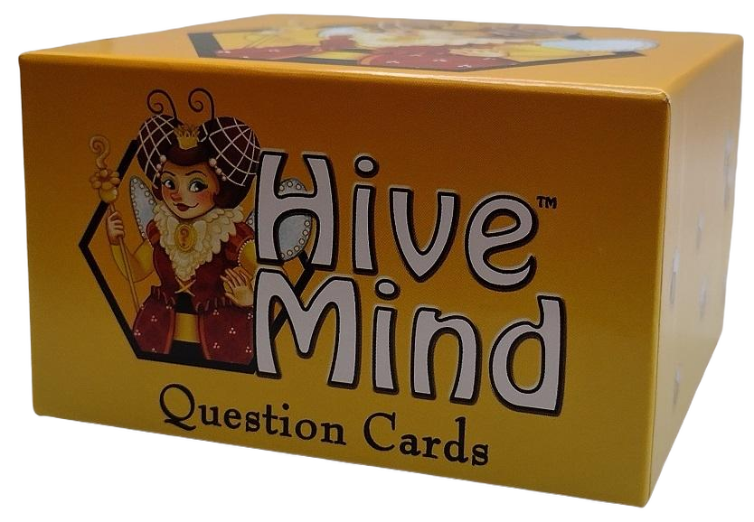 The Hive Mind board looks like a honeycomb hive, with a spiraling path of numbered spaces that represent your spot in the hive. Each player starts at the top and moves downward as rounds go by. How far you move depends on the die roll and how well your answers match with the rest of the group. Fall too far and you’re out of the hive.