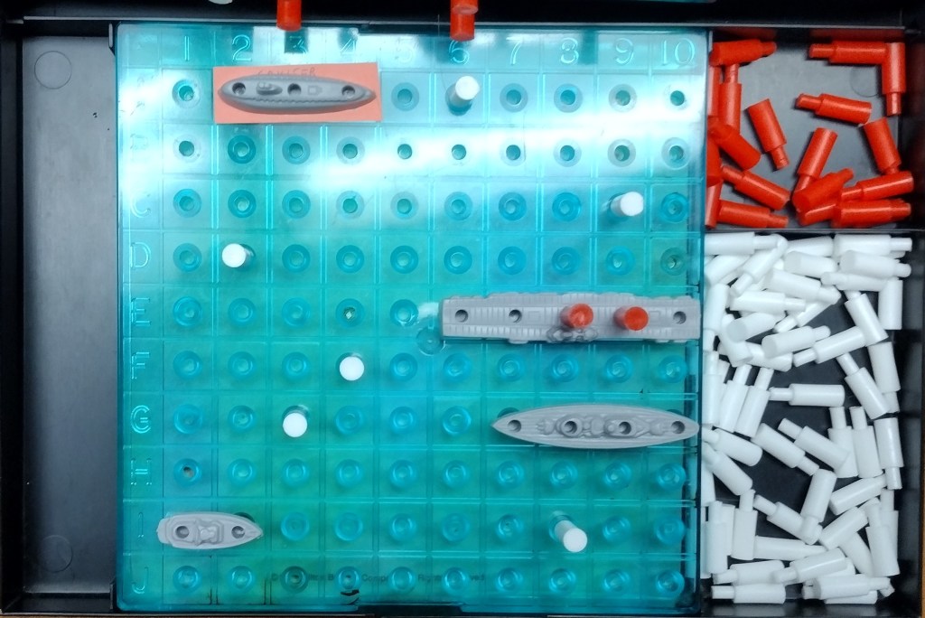 The image above reveals my side of the battlefield, showing the waters where my opponent has attempted to locate my hidden vessels. White pegs mark their unsuccessful shots—coordinates where only empty ocean was found. Red pegs indicate their successful strikes, revealing the locations where my ships have taken damage. For this particular match, we deployed four ships each, a variation that increased the difficulty and made every coordinate call more critical to the outcome.