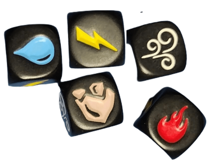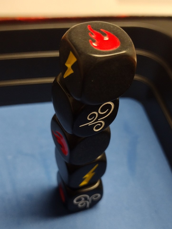 Each player starts with a handful of elemental dice and takes turns tossing them into a small arena. The goal is to make matching symbols. If you match symbols already in the arena, you collect those dice. If your die lands blank side up, it is out of the game. That is it. No complex rules, no reading involved, just pure cause and effect with every throw.