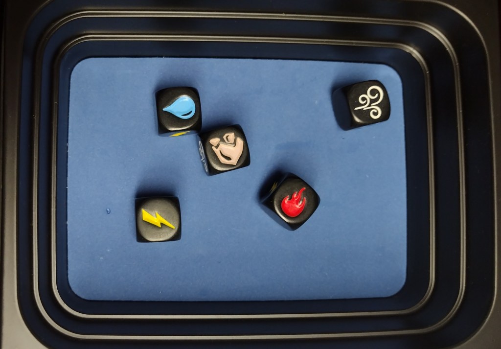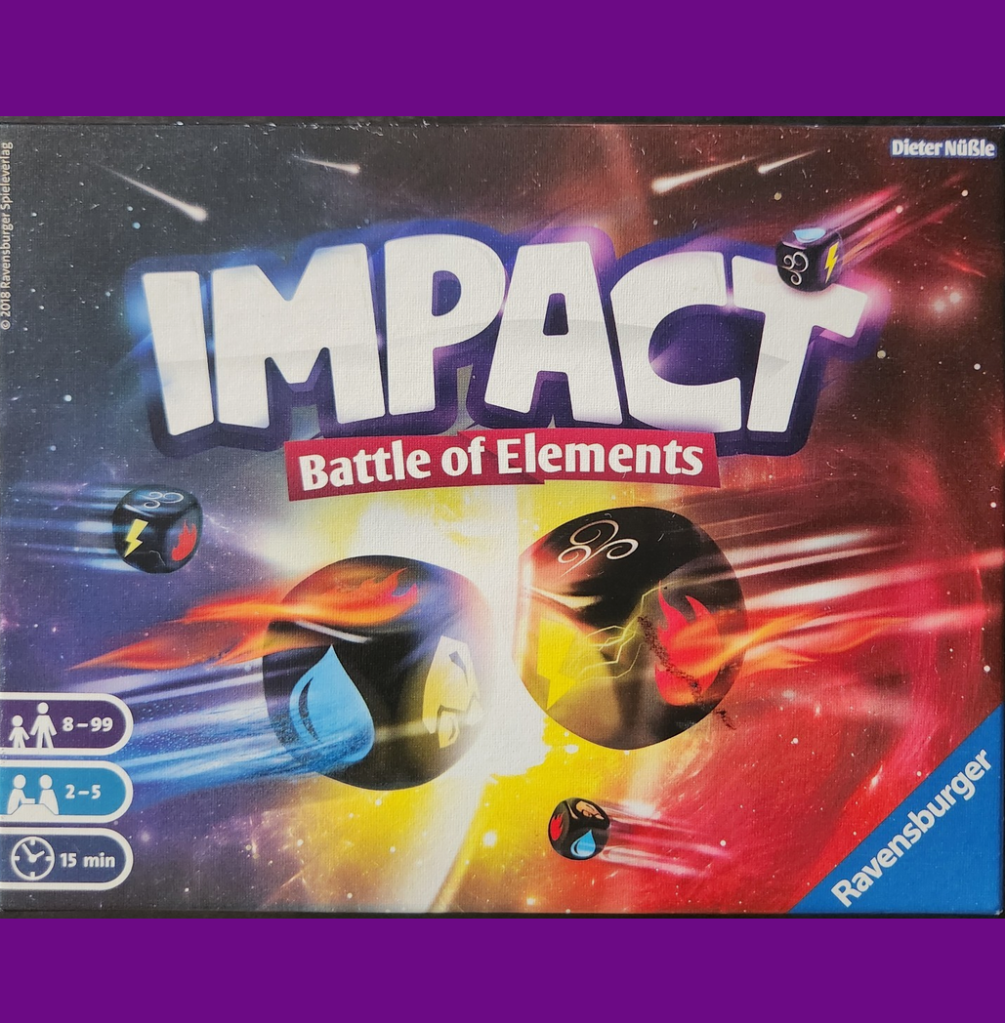 There is something truly satisfying about the sound of dice tumbling into a box. Impact: Battle of Elements takes that joy and builds a fast-paced, lightweight game around it that somehow feels both silly and strategic. I played this with two friends, though you can play with up to five, and we were instantly hooked. These are random images taken while playing..I didn’t want to disrupt our gameplay.