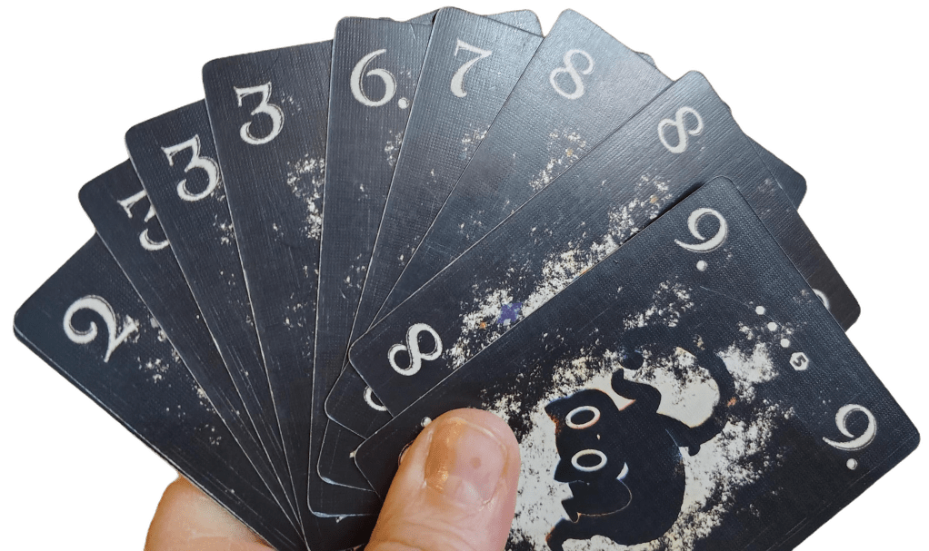 Inside, we found a stack of sleek cards, each with just a number and a stylish black face. That’s right, no suits, no red or blue or green, just numbers 1 through 9.