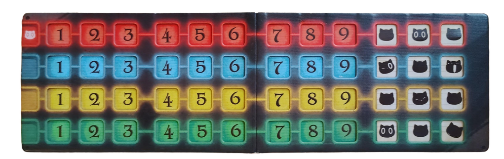 Your personal player board tracks your predictions about how many tricks you think you’ll win, and bonus points come from forming connected paths of declared suits on your board. Oh, check out the cards with equations on the back. This game has equations and cats everywhere, reminding me constantly that I did not pay attention as much as I should have in science class.