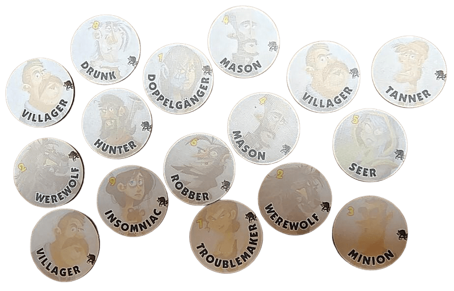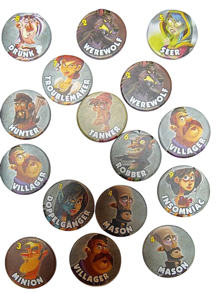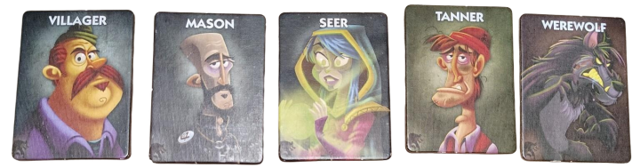Inside the box, you will find a small deck of role cards, a set of cardboard role tokens(above), and a helpful reference guide. Each card represents a character(below) in the village, such as a Villager, Seer, Mason, Tanner or Werewolf. There is also a free companion app that acts as the narrator, guiding everyone through the night phase and keeping the game moving smoothly. The compact size makes it easy to bring anywhere, which is always a bonus.