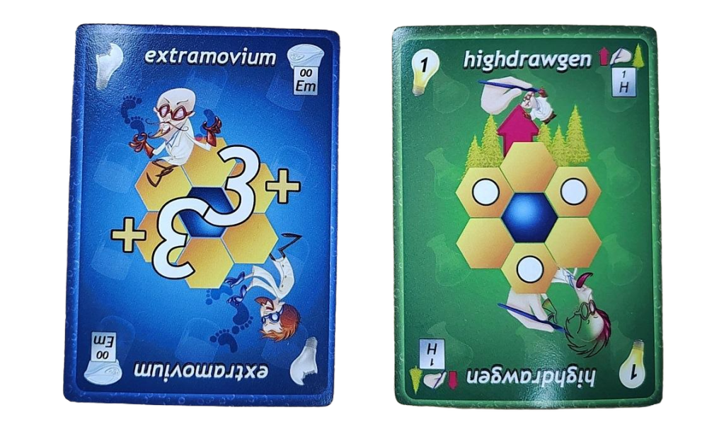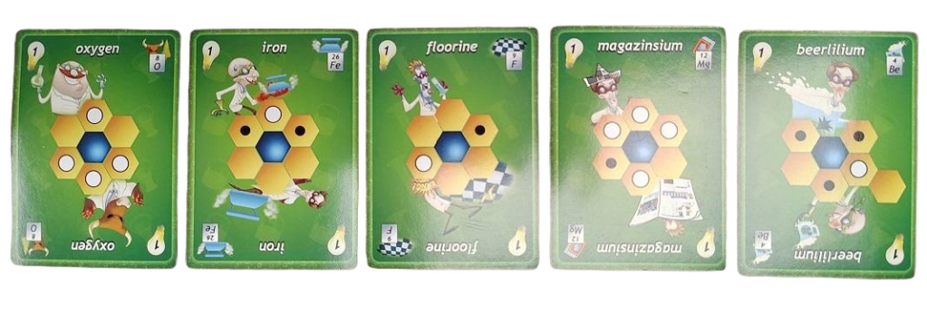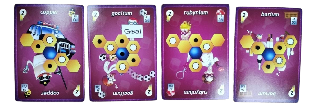 Inside the box, you will find a colorful deck of cards, a handful of tiles, and a sense of mischief. Each card features bizarre combinations of elements and compounds, the kind your high school science teacher would absolutely not approve of. Here are some more cards.